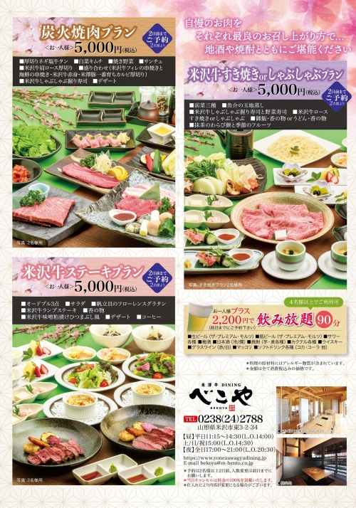 米澤牛DININGべこやよりお得なプランのご案内です。
